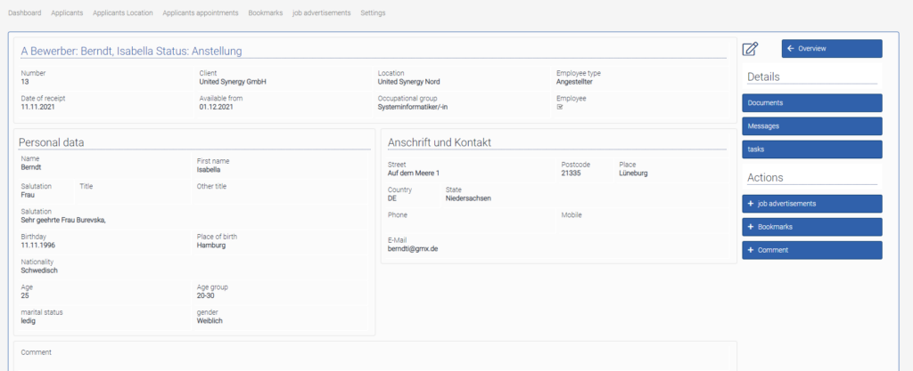Applicants can be edited via the view page. Via the actions and details, it is possible to carry out various actions for this applicant. These actions are described in more detail below.