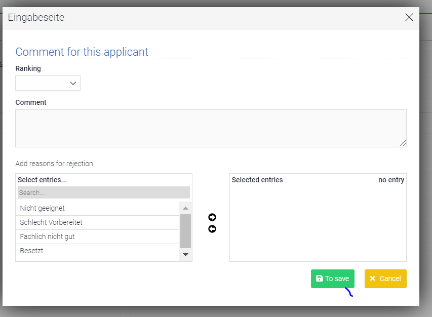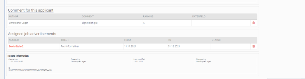 A classification as well as a comment on the applicant could be recorded here. The rating and comments are visible to all staff members who can see this applicant.