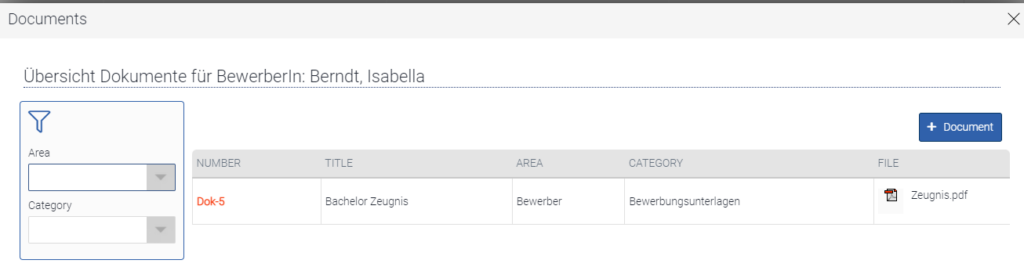 Here, all relevant documents such as e.g. Cover letter and references are uploaded. To attach a document to this applicant click on “+ Document”. A window opens and you can enter all the data there and upload the document.