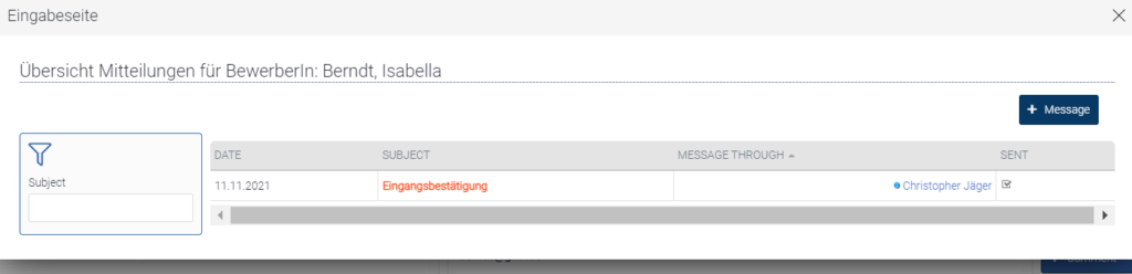 This tooltip provides an overview of all messages, in the form of a letter or e-mail. To send a message to this applicant click on “+ Message”. A window opens and you can enter all the data there.