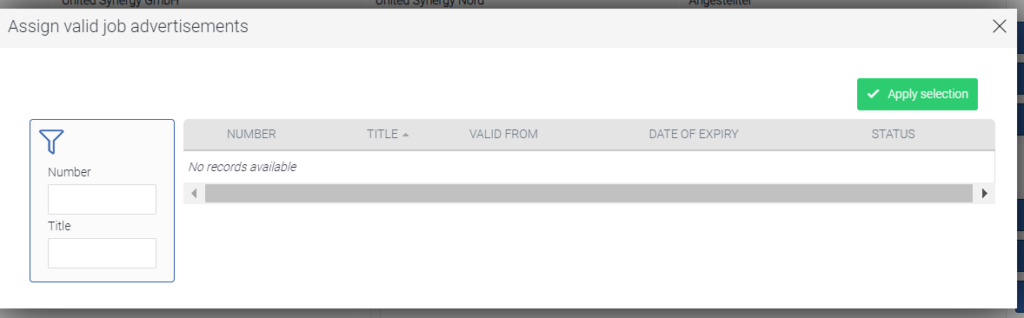 Clicking on “Job advertisement” opens a window in which various job advertisements that were previously created are displayed and can be selected. Click on Apply selection to assign the selected job advertisements to this applicant.